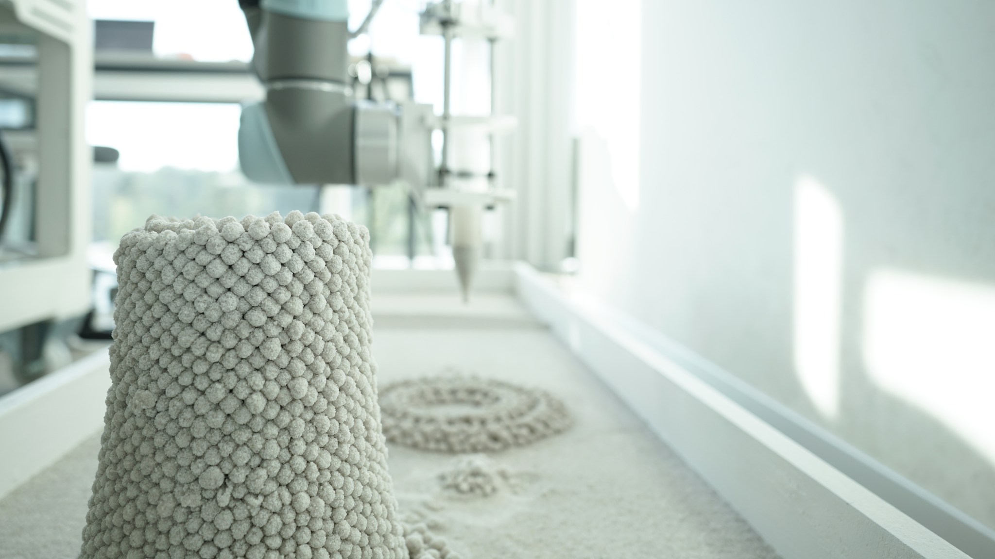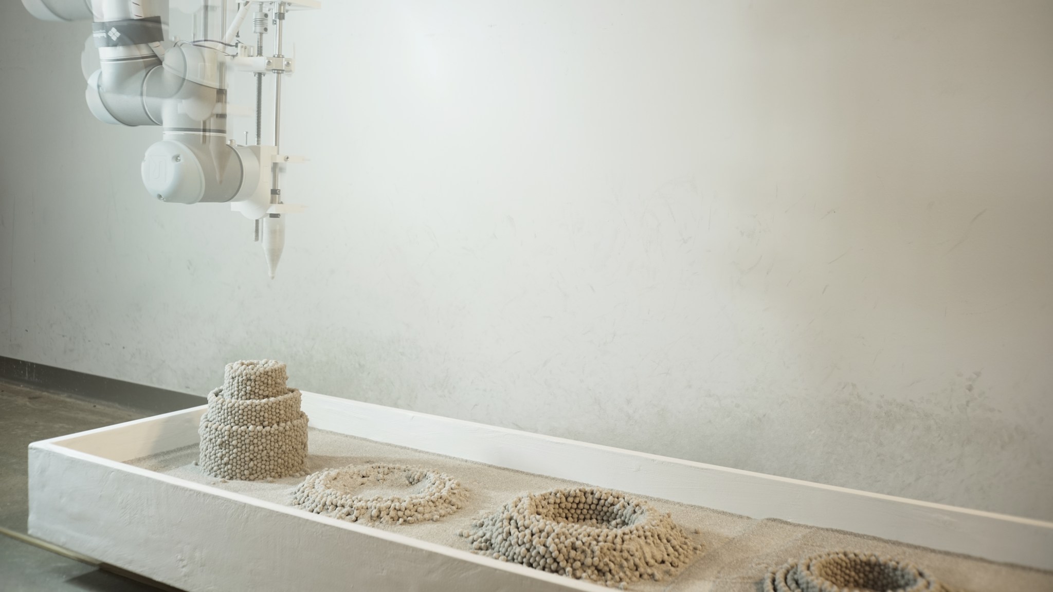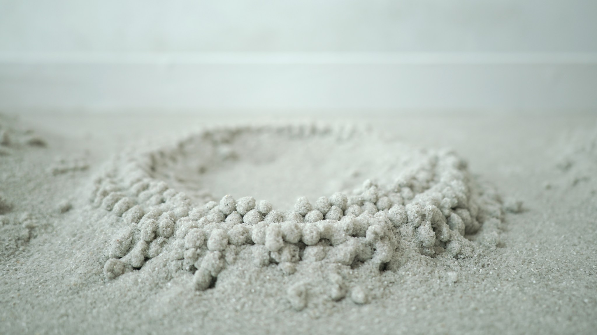 The main mechanism of RSD is based on capillary action that happens when wet granular matter drops onto a liquid-absorbing surface like a bed of dry sand. Given the fact that sand grains have no cohesive forces to bind each other, mixing with a liquid binder helps them become manipulable. Upon impact, the liquid in the droplet instantly forms micro liquid bridges, seizing the grains on the bed. Such a sand structure has a limited lifespan since the containing fluid medium evaporates over time, and the structure starts collapsing afterwards. Although this feature limits the permanence of the artefact, it provides potential to create momentary spatial experiences with a fully recyclable fabrication process.