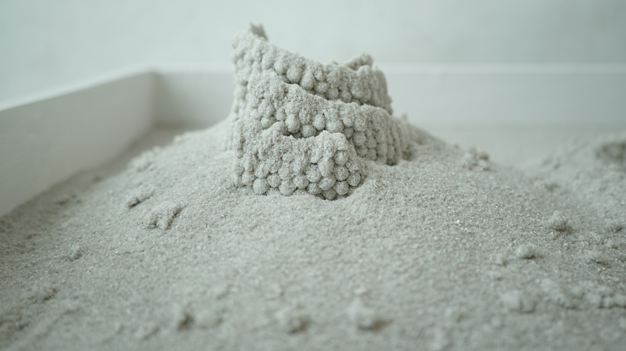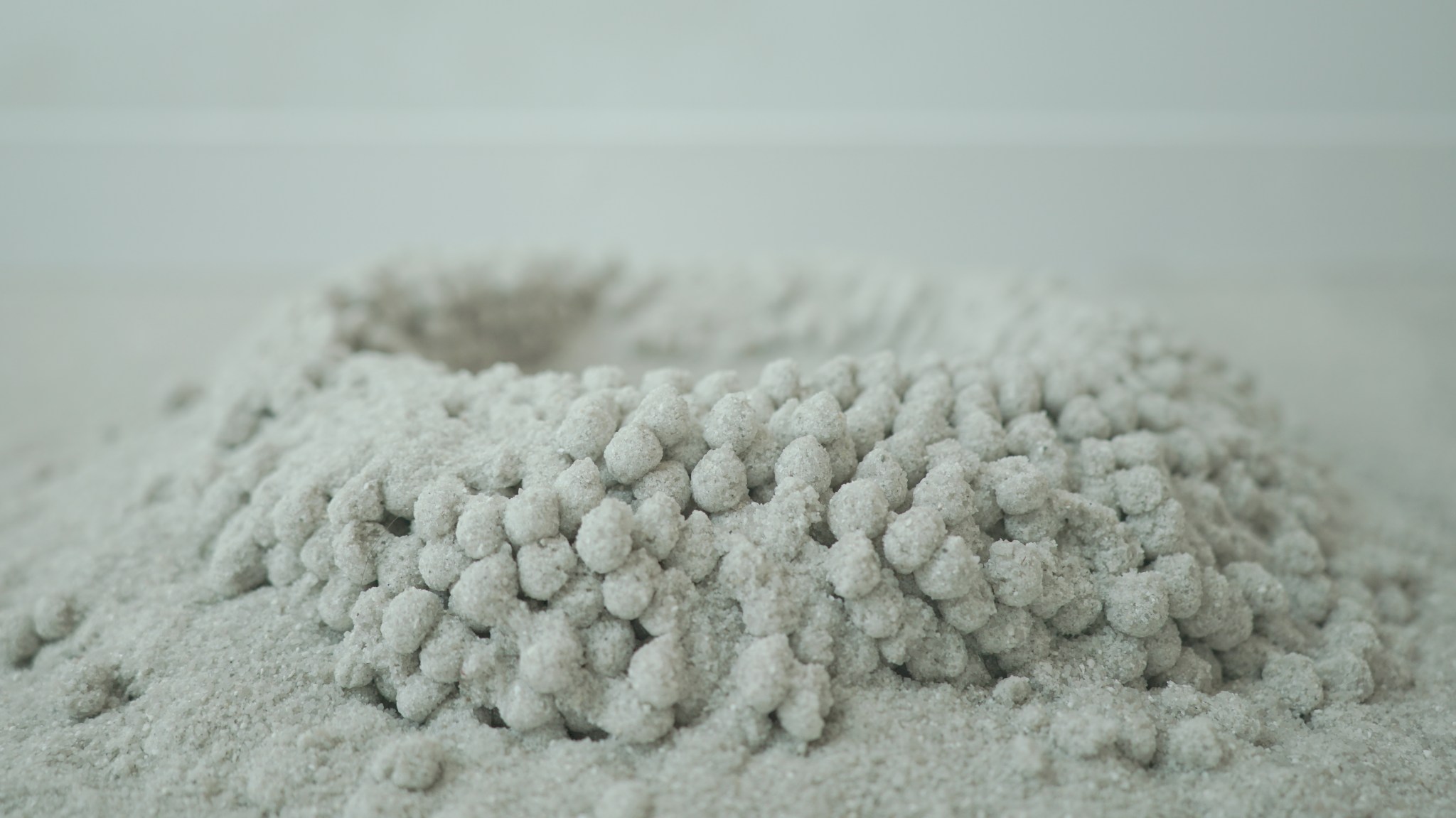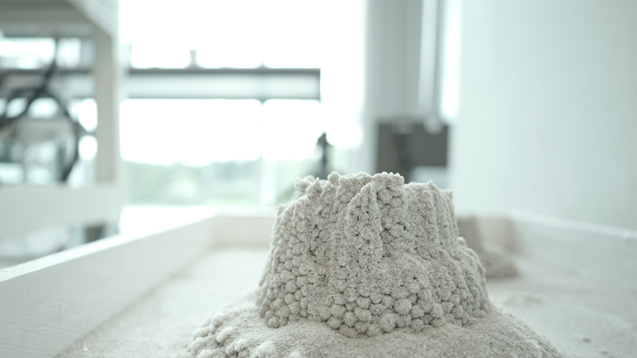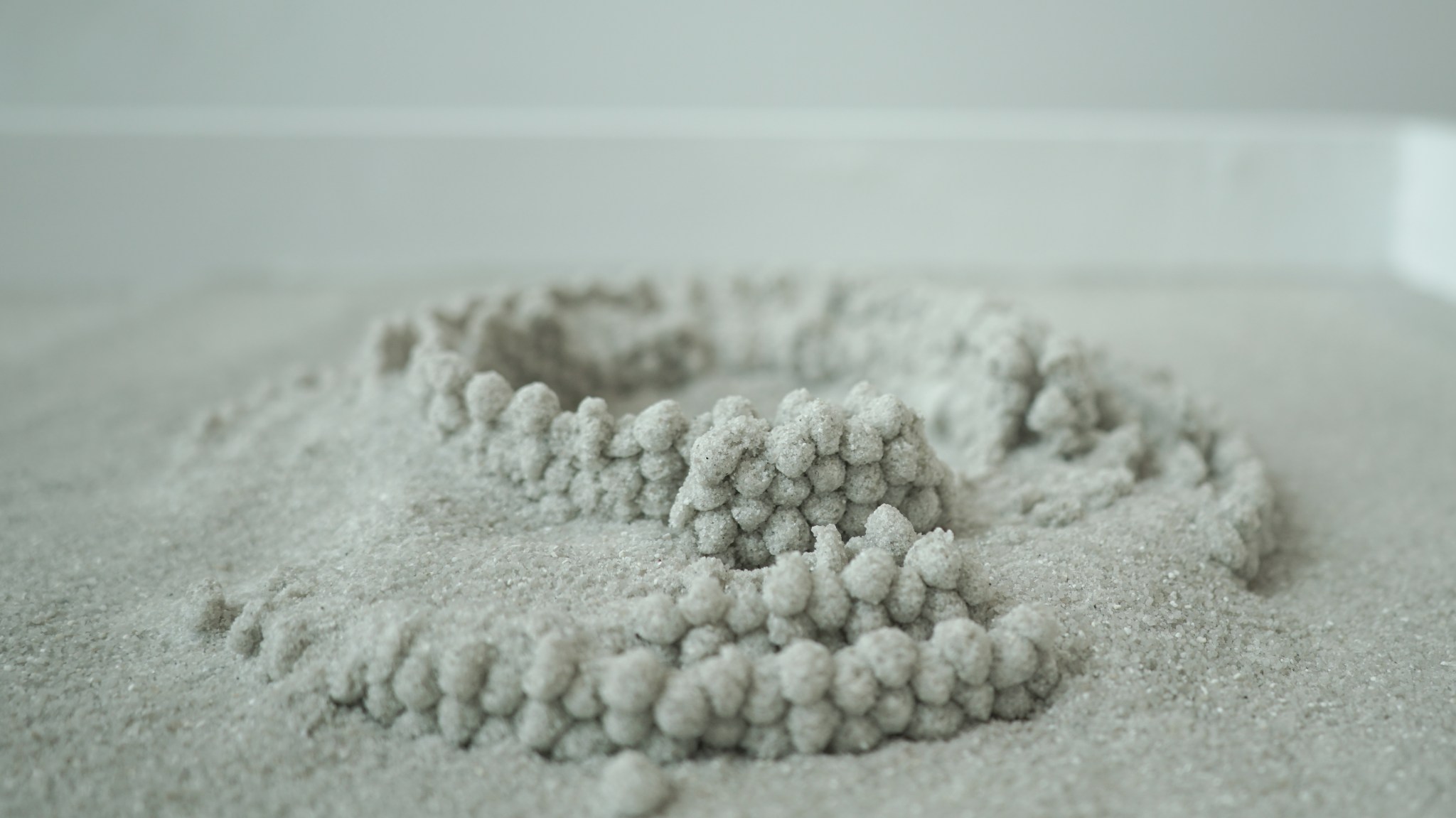 On the other hand, the uniqueness of RSD is it is flexible in adding dissolved material into water and easily manipulates the lifespan of the sand structure. To showcase the result, RSD uses natural material salt as the solidifying agent. Unlike mixing water with sand, the crystallization of salt strongly binds sand particles in the end. By using multiple binding materials, different fragility and temporality are introduced to the sand artifact.