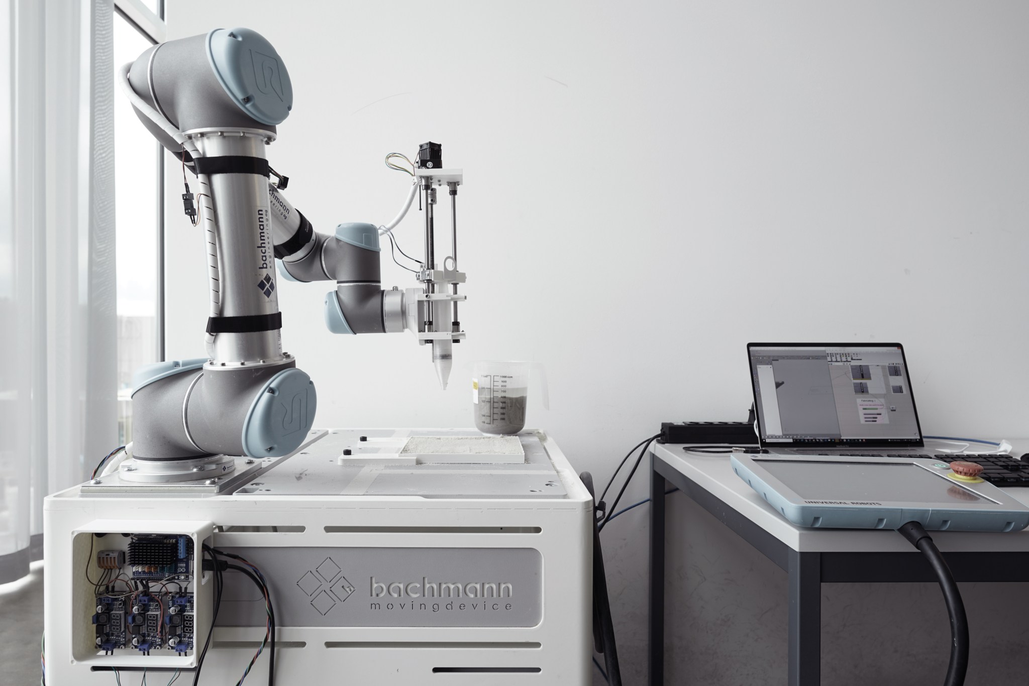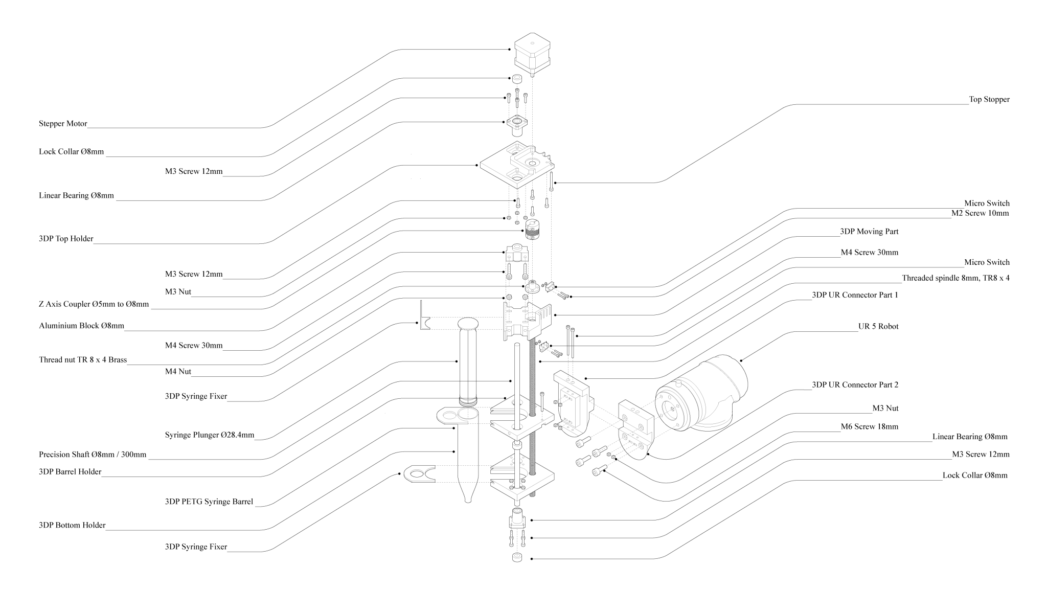 In order to seek possible temporary spatial performances and applications of RSD, it first requires the development of a custom-made end-effector. The principle is to keep the mechanism simple without using external forces to deliver material. The final design adopts a syringe system with a ⌀6mm barrel nozzle and a plunger driven by a stepper motor alongside the shafts.