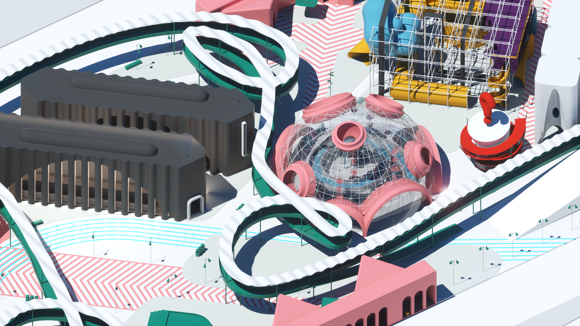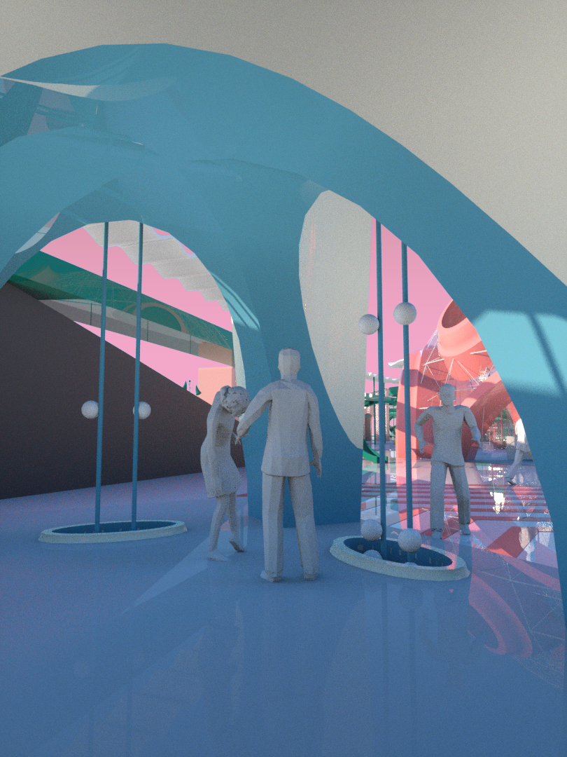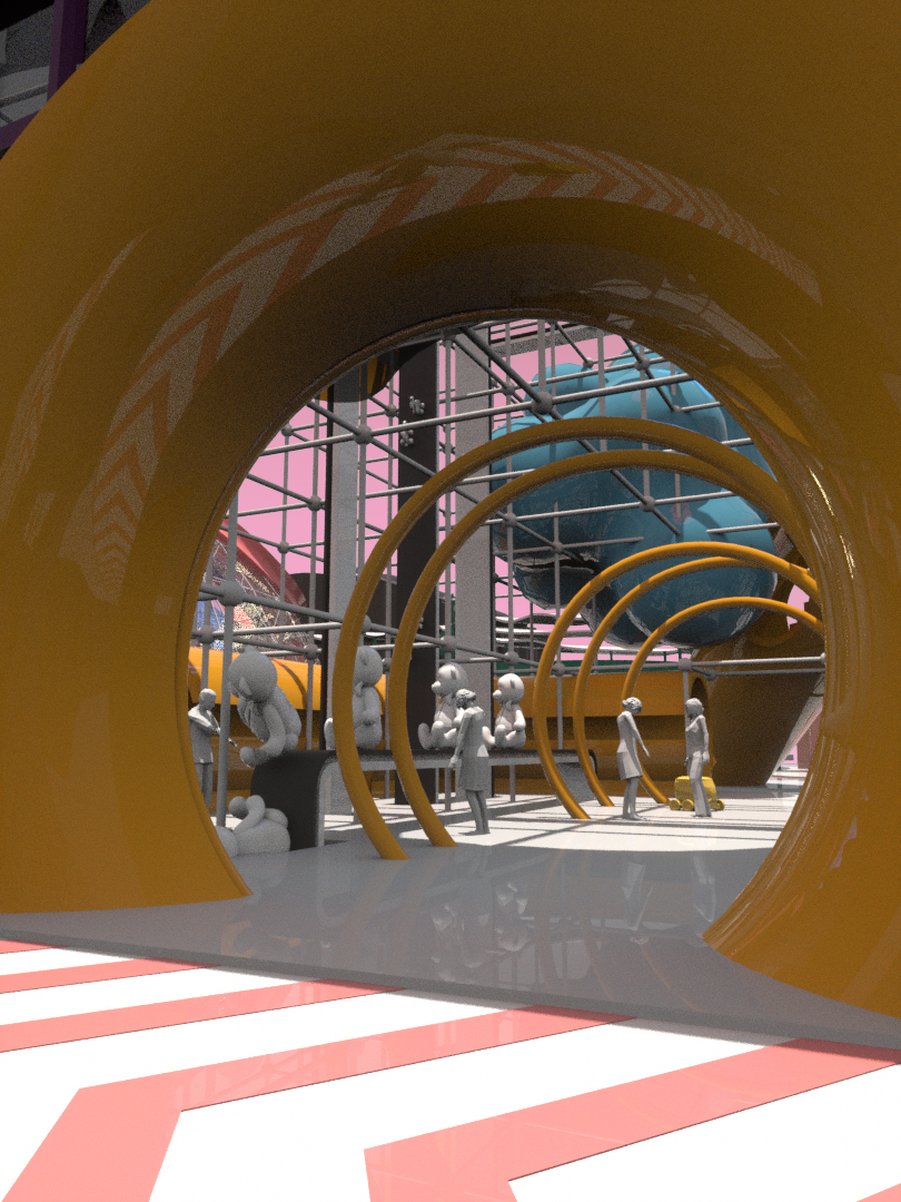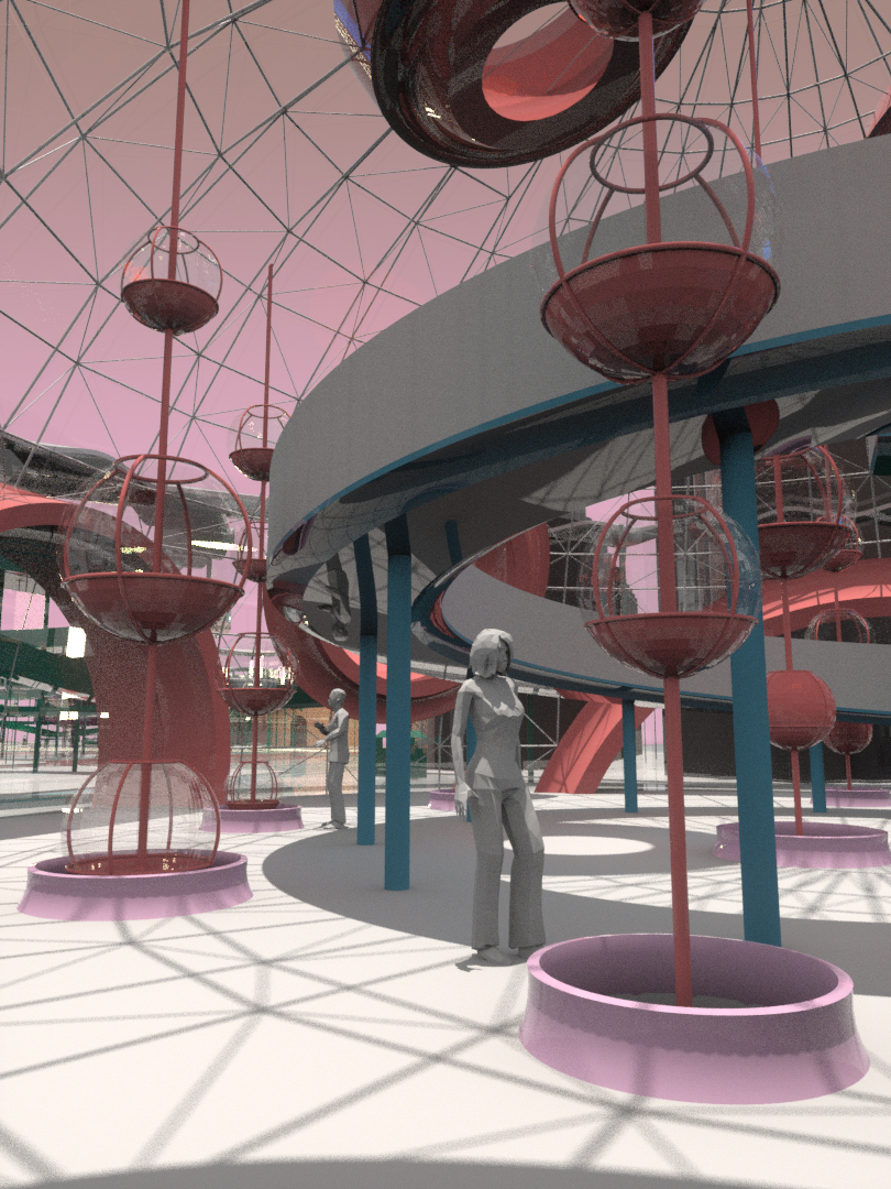 Moreover, the categories provide the opportunity to design discrete objects and treat this project like an experiment in micro-urbanism. We embrace the idea that various architects designing in a centralized master plan with their own idiosyncratic design sensibilities. The discrete objects allow us to test the simulation tools as a mean of creating a circula- tion, like to express the variation in speed through circulation geometry. The spectacle of the pavilion where people arrive are intended to be the primary experience; perhaps the outcome is an over-saturation of content but is not like the virtual market.