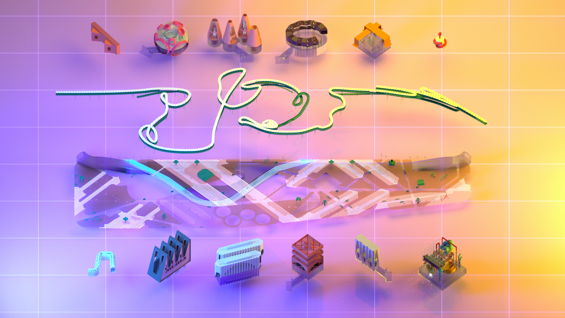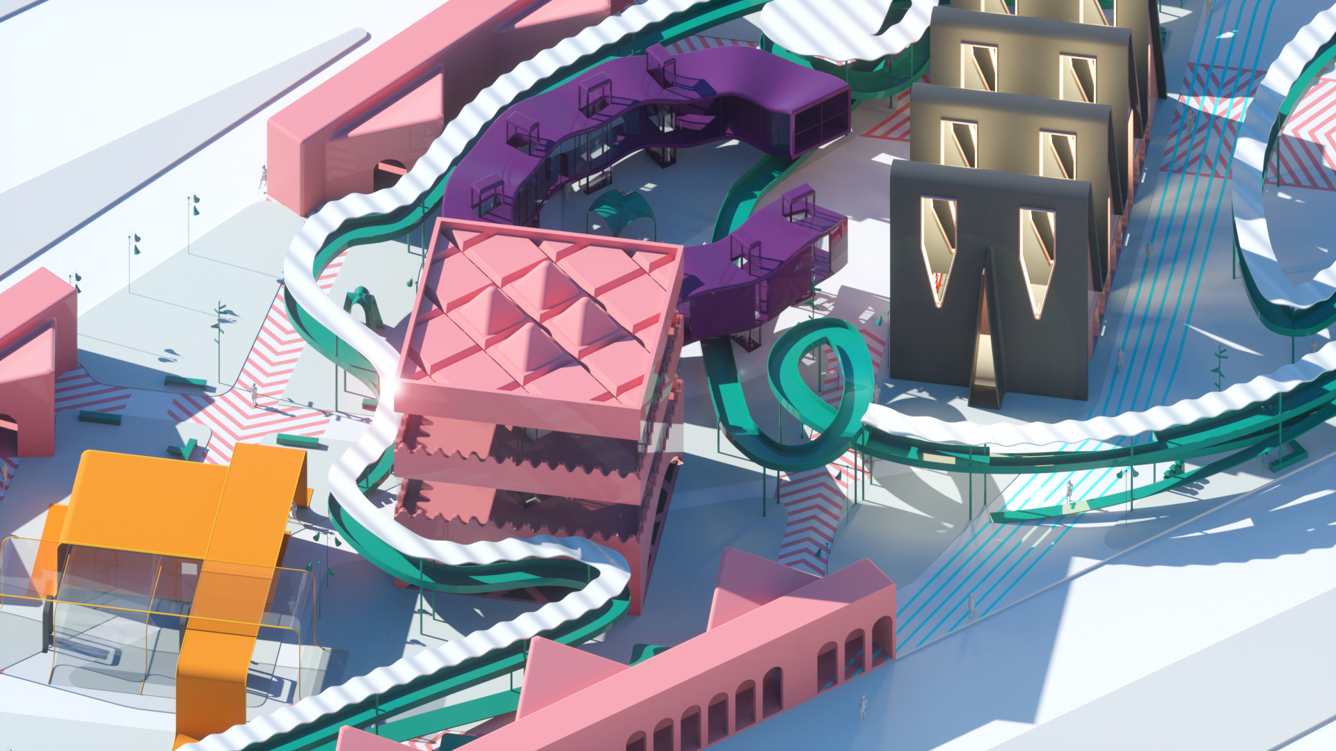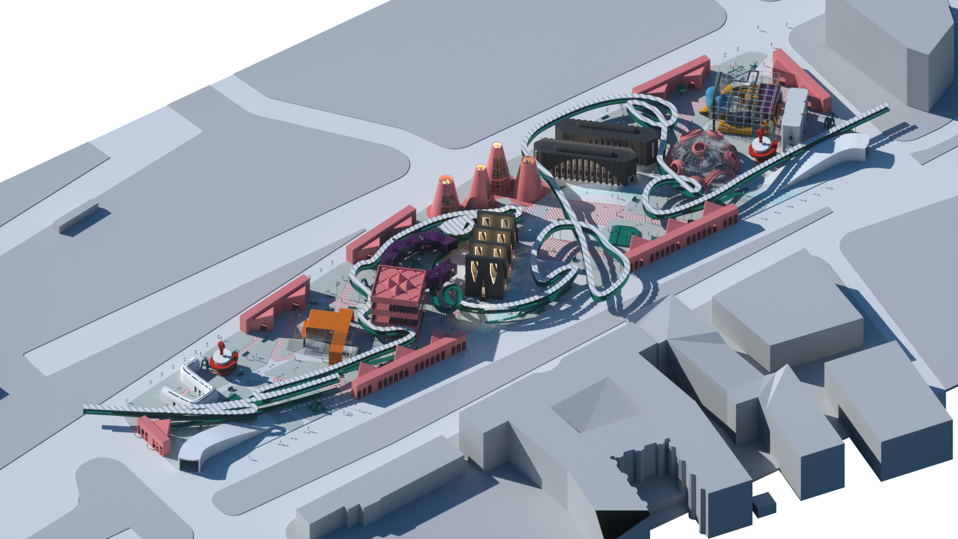 Moreover, the categories provide the opportunity to design discrete objects and treat this project like an experiment in micro-urbanism. We embrace the idea that various architects designing in a centralized master plan with their own idiosyncratic design sensibilities. The discrete objects allow us to test the simulation tools as a mean of creating a circula- tion, like to express the variation in speed through circulation geometry. The spectacle of the pavilion where people arrive are intended to be the primary experience; perhaps the outcome is an over-saturation of content but is not like the virtual market.