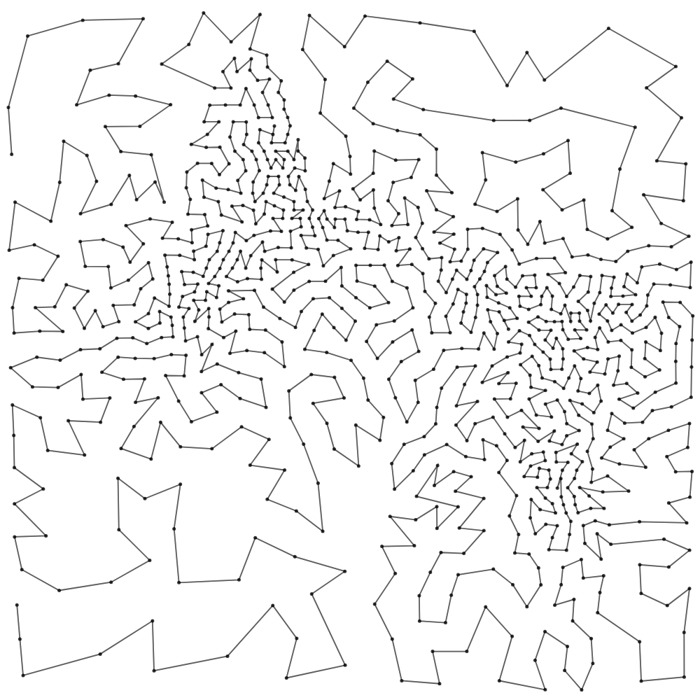 The result is a visually engaging and efficient traversal of space. For example, with 200 points, the algorithm reduces the path length by 15.2%, and with 1000 points, the reduction improves to 6.9%. This approach is ideal for generative art, pen plotting, and algorithmic design.